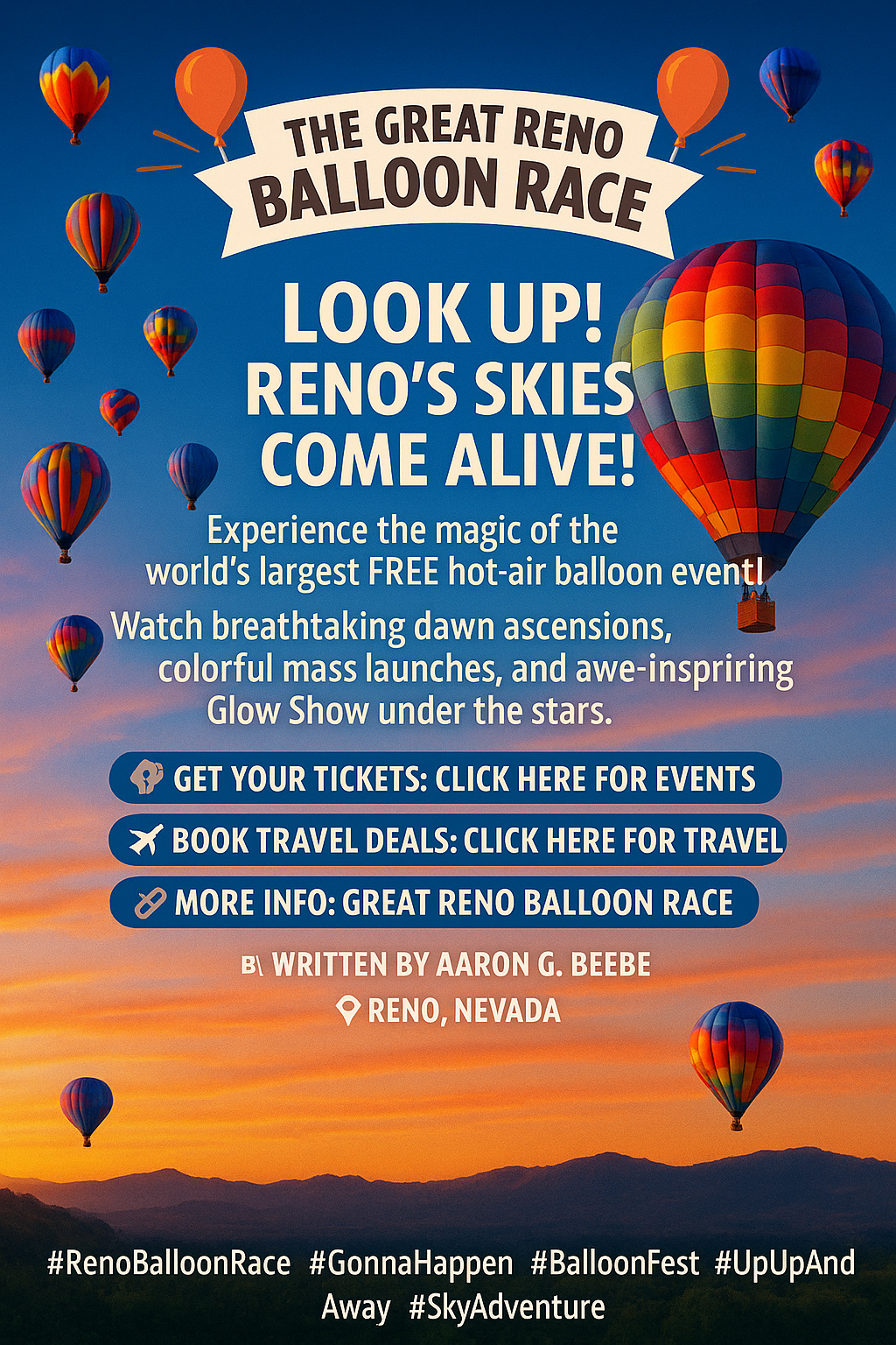 🎈 The Great Reno Balloon Race 🎈Look Up! Reno's Skies Come Alive!Experience the magic of the world's largest FREE hot-air balloon event! Watch breathtaking dawn ascensions, colorful mass launches, and ...